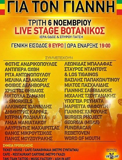 Την Τρίτη 6 Νοεμβρίου στο Βοτανικός Live Stage θα δοθεί συναυλία συμπαράστασης για τον Γιάννη… Μια συναυλία για τη ζωή… Μια συναυλία για την πίστη στις ανθρώπινες δυνάμεις και στις ανθρώπινες αξίες.