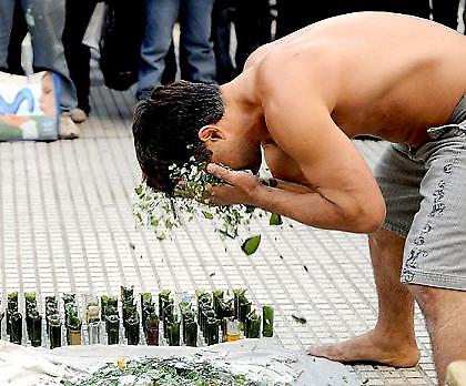 Ένα σόου διαφορετικό από τα άλλα παρουσιάζει ο Μάρκος Αντόνιο ντα Λουζ στη Florida Street. Συγκεκριμένα, ο 34χρονος άνδρας «πλένει» το πρόσωπό του με… σπασμένα γυαλιά από μπουκάλια (!) στο δρόμο που βρίσκεται στην πρωτεύουσα της Αργεντινής, στο Μπουένος Άιρες.