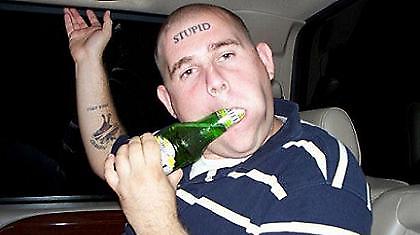 Τα λόγια είναι περιττά! Αφού το γράφει στο κούτελο δεν έχει παρά να το υποστηρίξει! Πολλοί είναι εκείνοι που θέλουν να έχουν το μέτωπό τους καθαρό, ενώ άλλοι χαρακτηρίζονται από ελαττώματα, τόσο φανερά, που μόνο στο κούτελο δεν το γράφουν! Ο άντρας της εικόνας δεν είχε παρά να επιβεβαιώσει με ένα τατουάζ αυτό που η φύση...του χάρισε! «Ηλίθιος», είναι η λέξη που τον αντιπροσωπεύει και με την οποία προειδοποεί τους γύρω του. Η επιτομή της αυτογνωσίας!