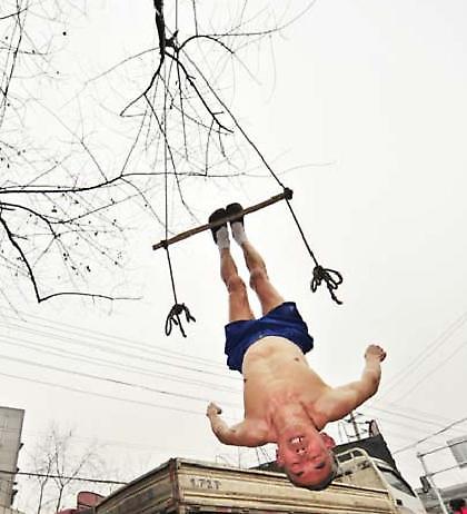 Έχετε βαρεθεί το τρέξιμο, τα βάρη και όλους τους γνωστούς τρόπους για να γυμναστείτε; Τότε η λύση έρχεται απ την Κίνα. Και συγκεκριμένα από έναν συνταξιούχο ο οποίος ανακάλυψε μία νέα μέθξοδο γυμναστικής. Τι χρειάζεστε; Απλώς, ένα δέντρο, σχοινί και μπόλικο θάρρος για να κρεμαστείτε ανάποδα....