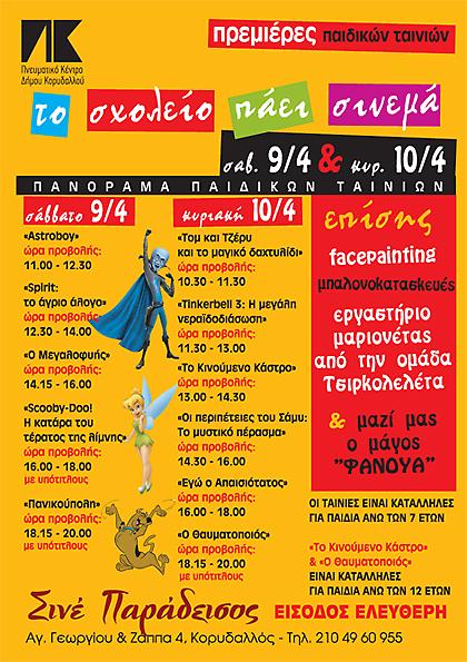 O Δήμος Κορυδαλλού, το Πνευματικό Κέντρο και η Make a Film σας καλούν το ΣΑΒΒΑΤΟ και την ΚΥΡΙΑΚΗ 9-10/4 στο χώρο του κινηματογράφου (Αγ. Γεωργίου και Ζάππα 4, Κορυδαλλός – τηλ.2104960955) στο πανόραμα παιδικών ταινιών: «ΤΟ ΣΧΟΛΕΙΟ ΠΑΕΙ ΣΙΝΕΜΑ»