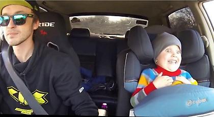 Μπόμπιρας ξεκαρδίζεται από τη θέση του συνοδηγού την ώρα που ο μπαμπάς του κάνει ντρίφτινγκ.
