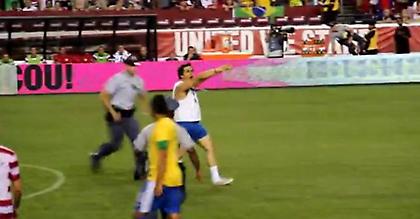 Ήταν δευτερόλεπτα μετά το τέταρτο γκολ της Βραζιλίας στη φιλική νίκη επί των ΗΠΑ στο Μέριλαντ (4-1), όταν ένας μεσήλικας οπαδός με ντύσιμο... δεκάχρονου εισέβαλε στον αγωνιστικό χώρο κι άρχισε να πανηγυρίζει, θέλοντας προφανώς να γίνει πρώτη μούρη στην τηλεόραση.