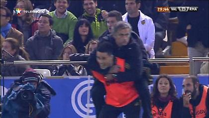 Ο Ζοσέ Μουρίνιο πανηγύρισε σαν τρελαμένος οπαδός το τρίτο γκολ της Ρεάλ Μαδρίτης στη νίκη με 3-2 επί της Βαλένθια στο «Μεστάγια». Μόλις είδε τον Κριστιάνο Ρονάλντο να πετυχαίνει το 3-1 στο 79ο λεπτό της αναμέτρησης, ο Πορτογάλος τεχνικός πήρε φόρα και σκαρφάλωσε στην πλάτη του Χοσέ Μαρία Καγεχόν.