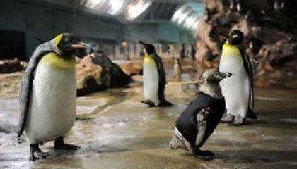 Όχι, δεν πρόκειται για κάποιο καπρίτσιο των υπευθύνων του πάρκου. Ο εικονιζόμενος πιγκουίνος πάσχει από μία σπάνια ασθένεια που κάνει τα φτερά του να πέφτουν. Με την ειδική στολή προστατεύει τα φτερά του όταν κολυμπά και διατηρεί την θερμοκρασία του σώματος του.