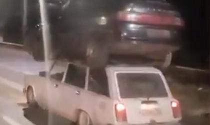 Απίστευτες εικόνες από αυτοκινητόδρομο της Ρωσίας με παλιό αυτοκίνητο, να κουβαλάει ένα άλλο τρακαρισμένο στην οροφή του!