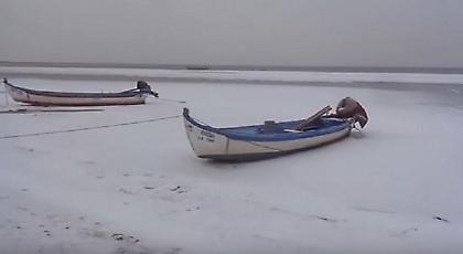 Εντυπωσιακές εικόνες εντοπίσαμε online, με την παραλία Μεθώνης στην Πιερία να είναι παγωμένη.