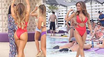 Φορώντας ένα άκρως αποκαλυπτικό κόκκινο μαγιό, η μικρόσωμη αλλά... θαυματουργή Ντάφνι Τζόι έφερε αναστάτωση στο Λας Βέγκας.