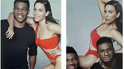 Η δημοφιλής τραγουδίστρια φόρεσε ένα σέξι κόκκινο κορμάκι και φωτογραφήθηκε αγκαλιά με τους δύο αθλητές