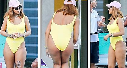 Η Ριάνα εμφανίστηκε σε πισίνα ξενοδοχείου της Ελβετίας με κίτρινο ολόσωμο μαγιό και προκάλεσε αναστάτωση με τις καμπύλες της.