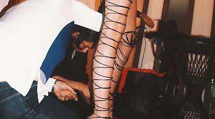 Η 19χρονη ποζάρει σχεδόν γυμνή μόνο με το εσώρουχο κρύβοντας με τα χέρια τα απαραίτητα ενώ φοράει ένα τσόκερ.