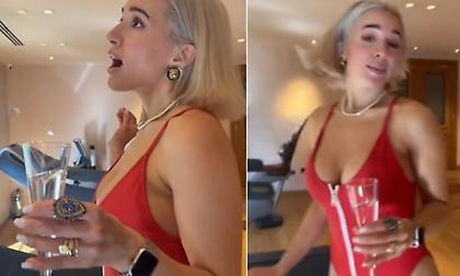 Γυμνάζεται φορώντας κόκκινο μαγιό και με σαμπάνια στο χέρι η Καλομοίρα.