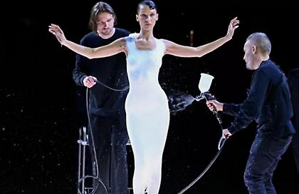 Η στιγμή αναμφίβολα θύμισε στους λάτρεις της μόδας το αξέχαστο show του Alexander McQueen, το 1999, όταν μηχανές ψέκασαν με μπογιά το λευκό φόρεμα της Shalom Harlow.