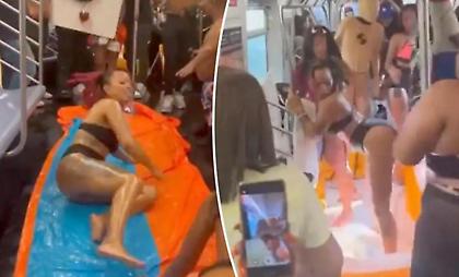 Απίστευτες εικόνες σε συρμό του μετρό της Νέας Υόρκης, όπου γυναίκες εμφανίστηκαν με μαγιό και έκαναν... twerking party, έχοντας μαζί τους φουσκωτές πισίνες και μια τσουλήθρα με νερό.